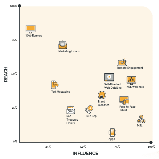 Efficiency of a channel based on its reach and influence according to HCPs. Source: The Digital Savvy HCP 2017, Pharmafuture)